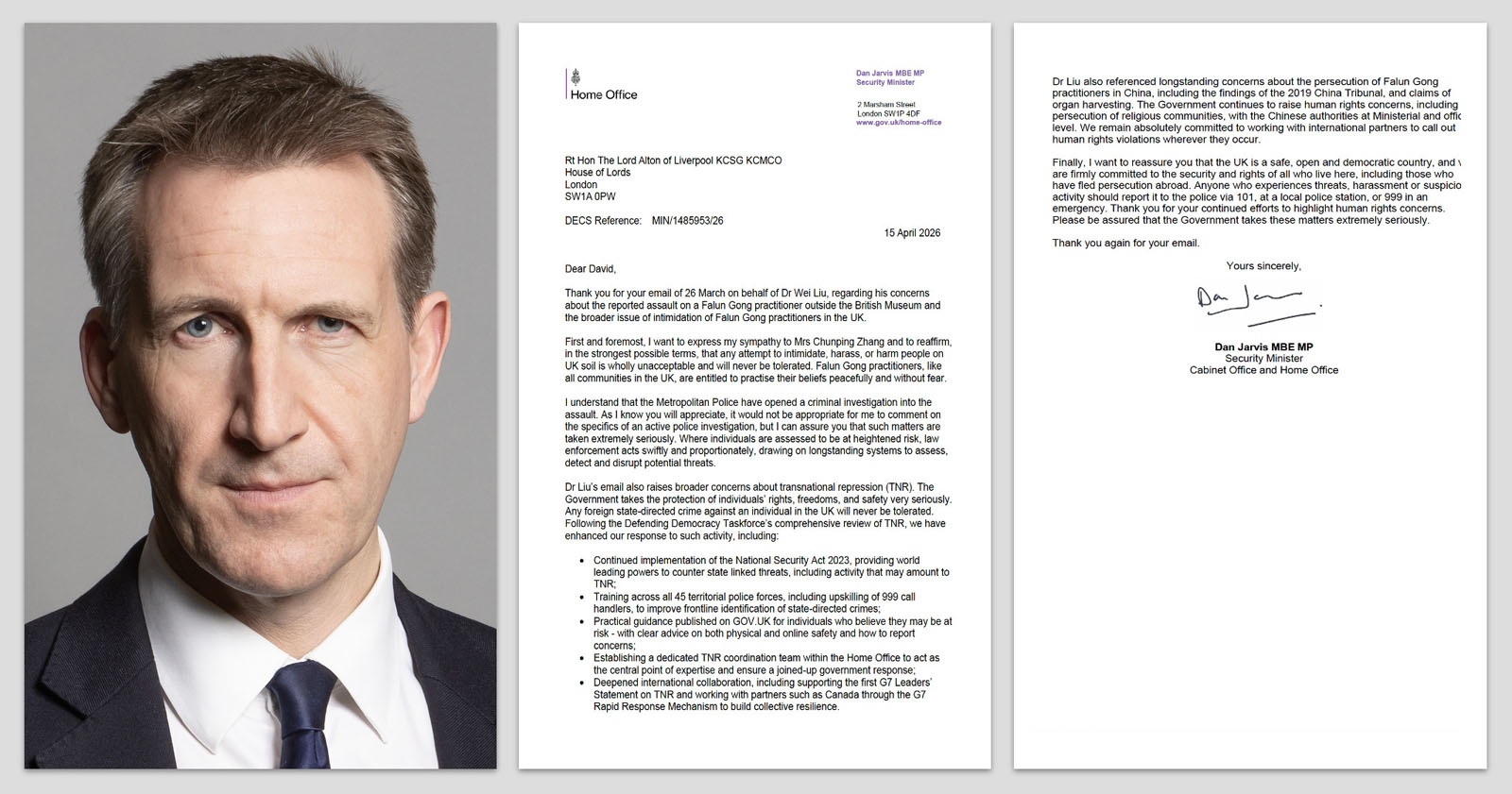 刘博士在来信中还提及对“跨国镇压”(Transnational Repression, TNR)的广泛关切。英国政府高度重视对个人权利、自由与安全的保护。任何外国政府在英国境内针对个人实施或指使的违法行为,都是绝不容忍的。在“捍卫民主工作组”完成对跨国镇压问题的全面评估后,政府已进一步强化应对措施,包括:
