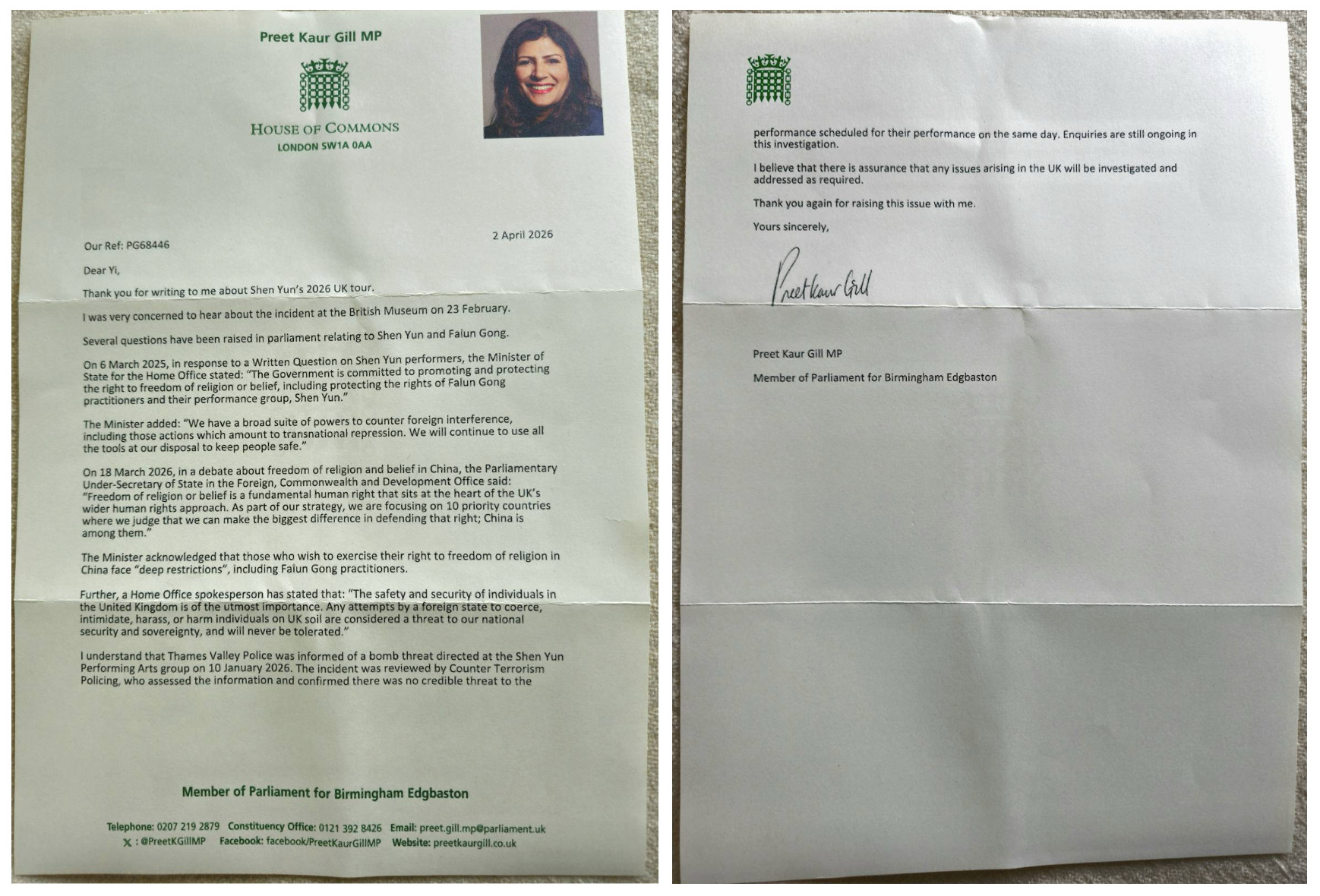 英国国会议员普利特‧考尔‧吉尔在给选民的回信中表示:“对于2月23日在大英博物馆发生的事件,我深感关切。议会中已就神韵和法轮功相关问题提出了多项质询。”