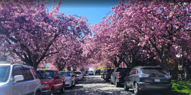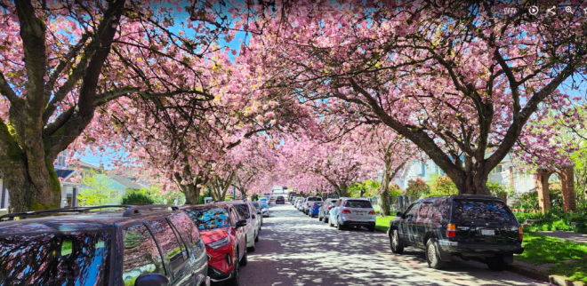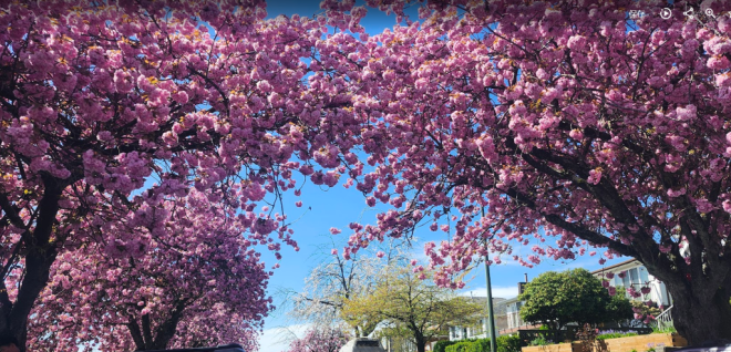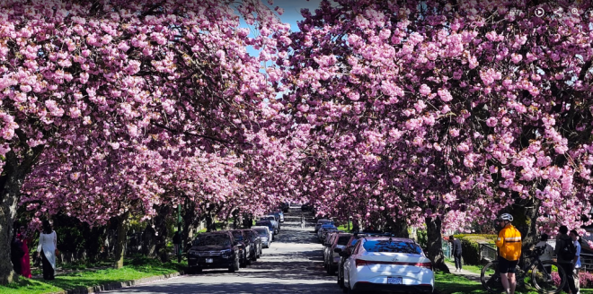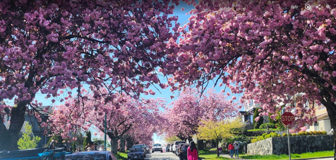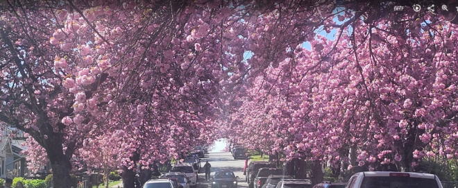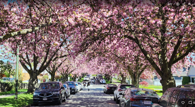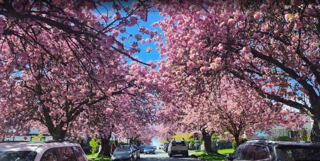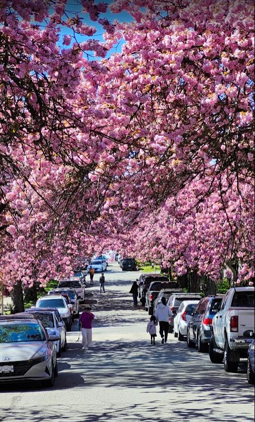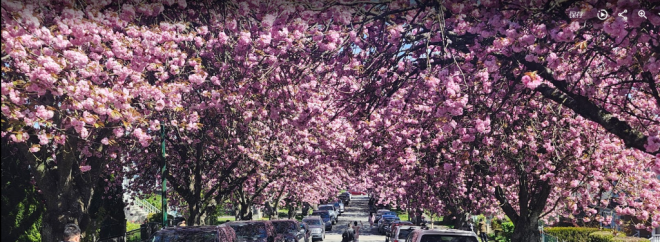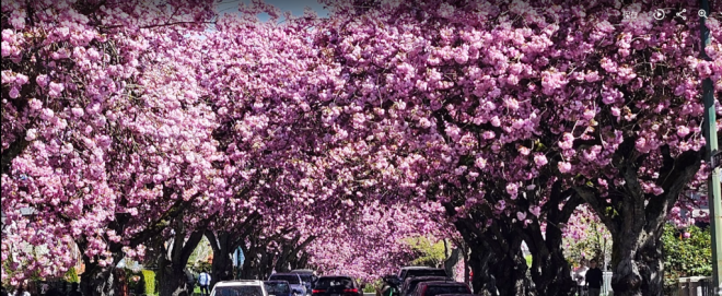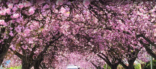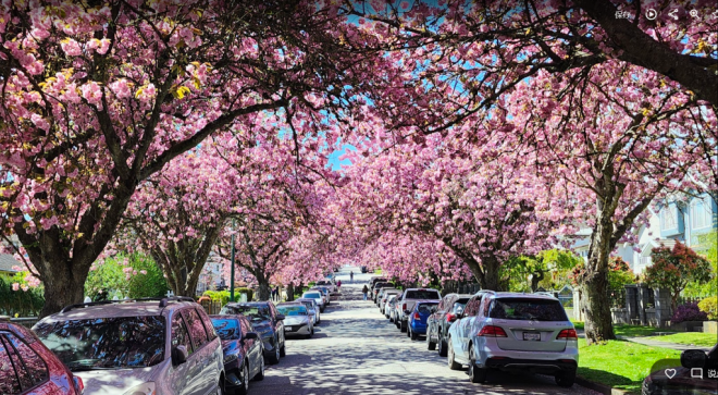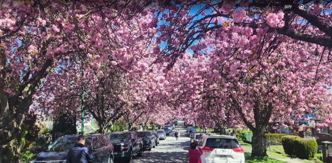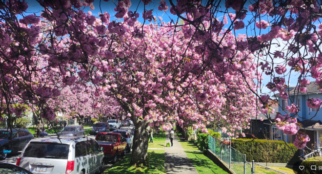 现在正是温哥华关山樱盛开的季节,尤其东7街堪称是关山樱的“王者街”,两侧巨大的关山樱已在空中形成穹顶,现在正热烈绽放,满树烂漫。