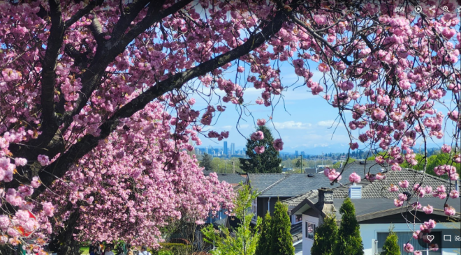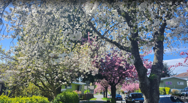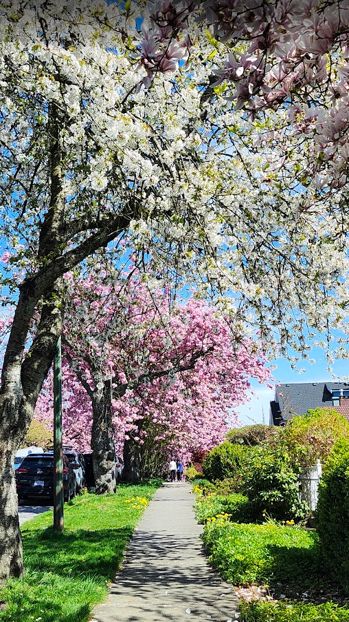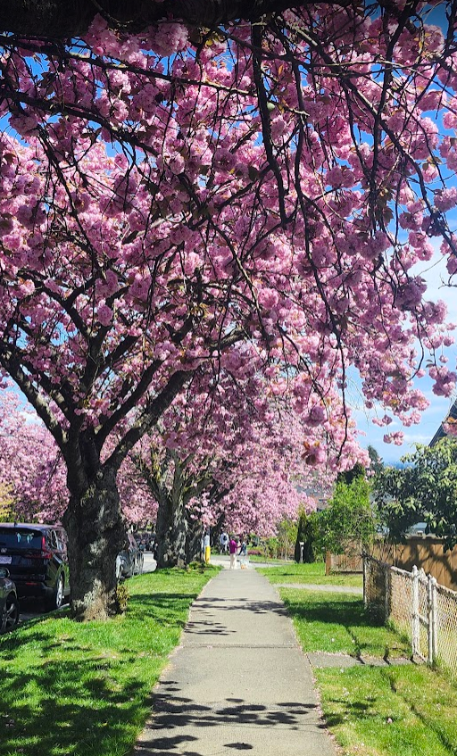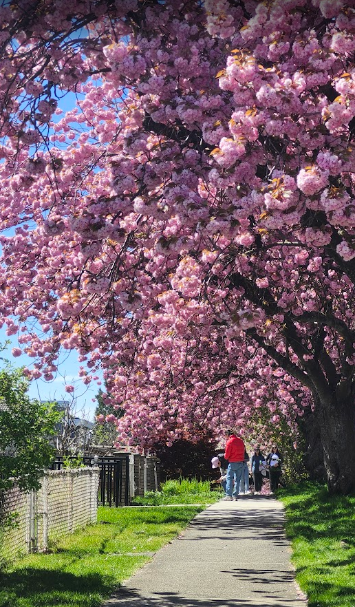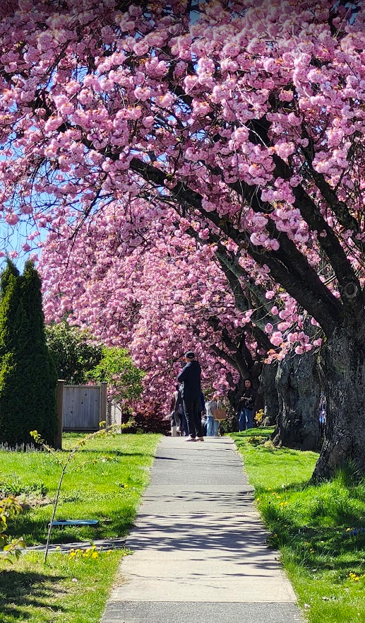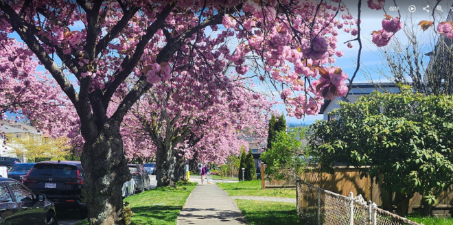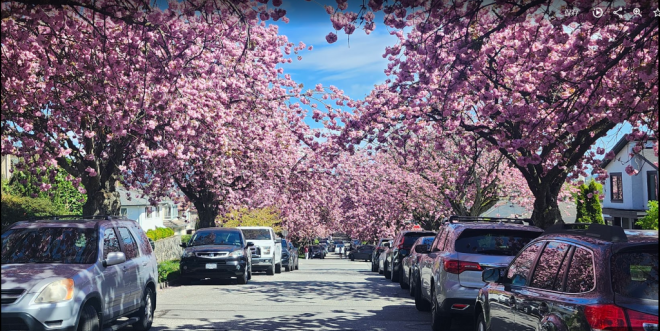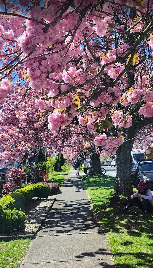 现在正是温哥华关山樱盛开的季节,尤其东7街堪称是关山樱的“王者街”,两侧巨大的关山樱已在空中形成穹顶,现在正热烈绽放,满树烂漫。