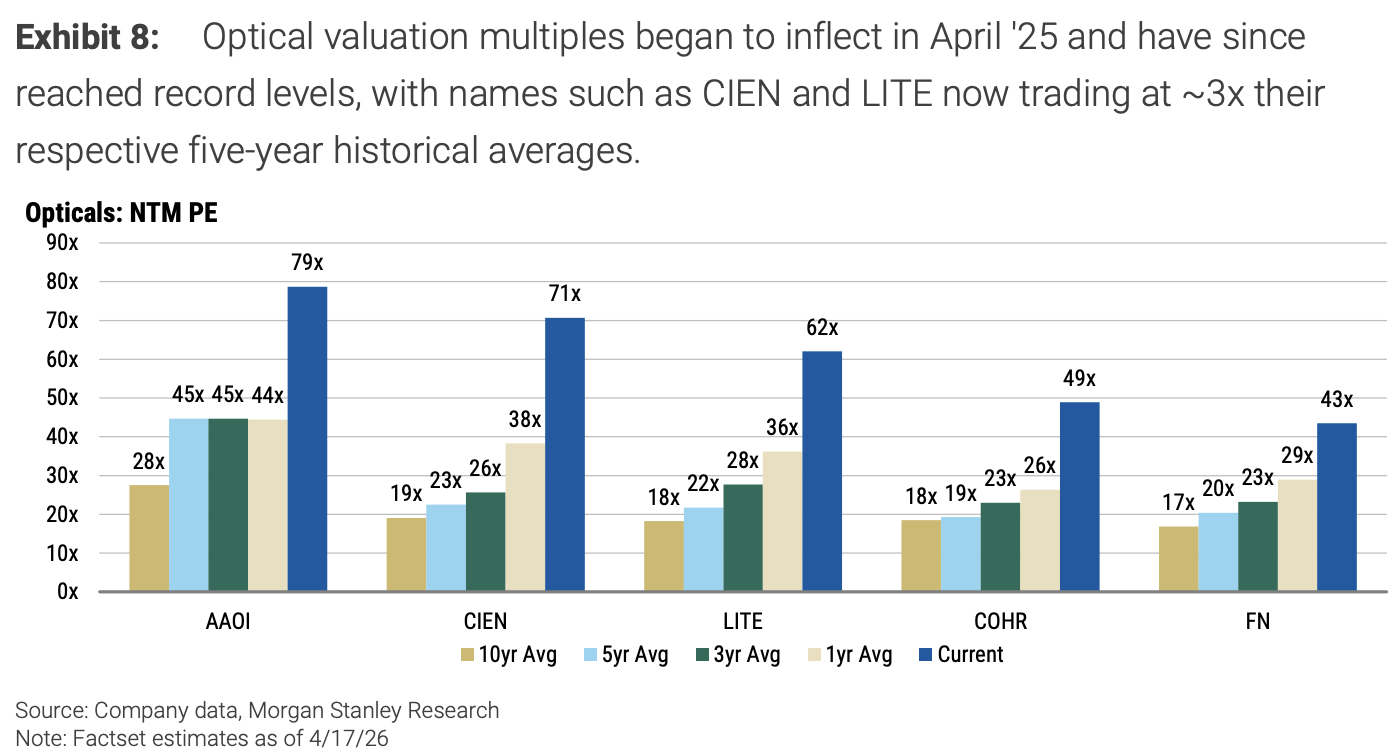 AI数据中心建设浪潮持续推升光通讯需求,相关个股近期大幅上涨,估值全面突破历史区间。