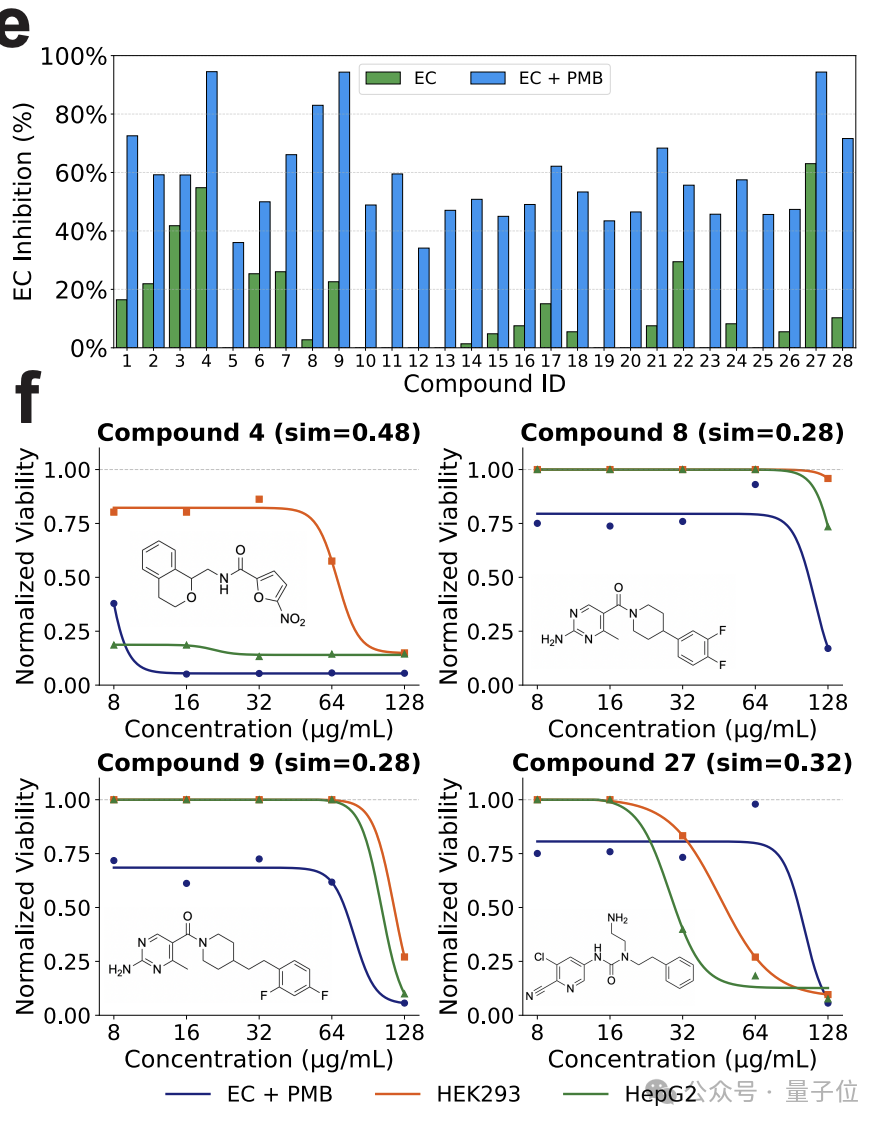 如下图,在 28 个计算出来的分子中,4 个在 128μg/mL 浓度下对 E. coli 抑制率超过 80%。