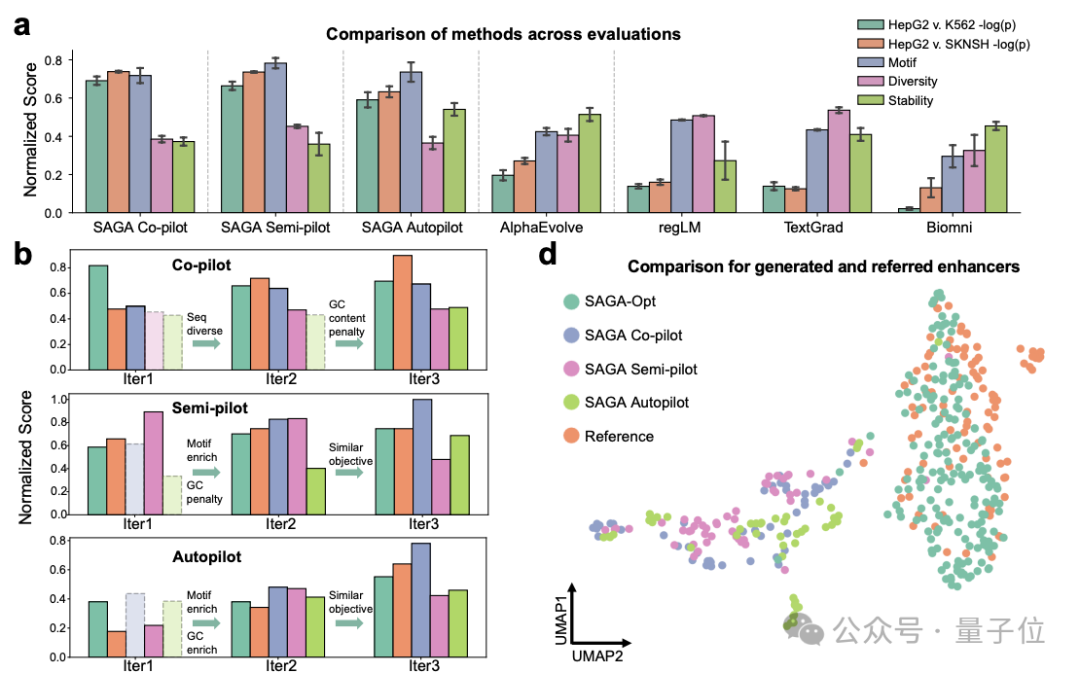 在其他基于计算指标来验证的任务上,SAGA 同样表现出色。比如 SAGA 可以被用在 DNA 增强子设计上,从而让科学家们设计能” 开关” 特定细胞里基因表达的 DNA 片段。