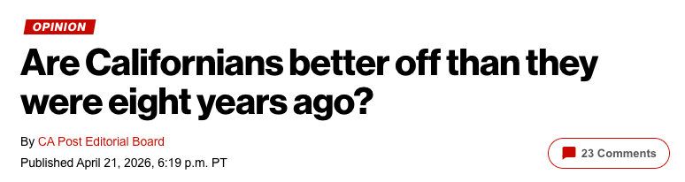 如今,同样的问题被重新放在加州面前:当前的加州是否更负担得起?是否更安全?学校是否改善?交通是否更顺畅?税负是否下降?能源是否更便宜、更充足?