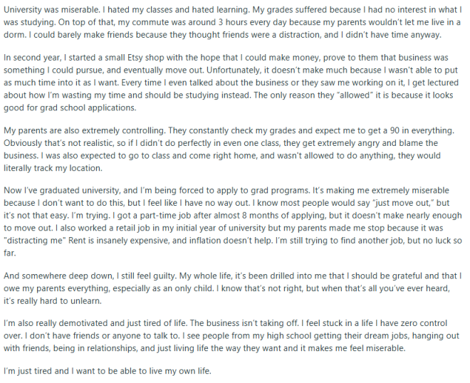 她在帖子的最后写道:“我感觉自己被困在一个完全无法掌控的人生里。我没有朋友,也没有可以倾诉的人。我看着高中同学找到理想工作、和朋友聚会、谈恋爱、过着自己想要的生活,而我却感到非常痛苦。”