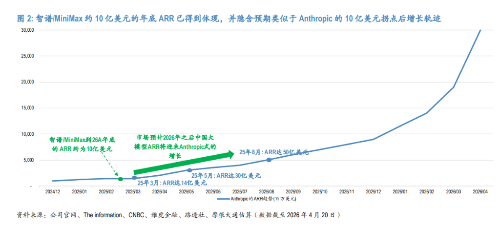 摩根大通的测算是:市场已经隐含智谱2026年底ARR(年化经常性收入)约达10亿美元,MiniMax约达7亿美元。