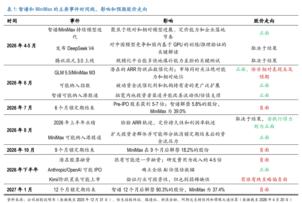 MiniMax:7月初解禁39.0%,10月前后再解禁18.2%,2027年1月解禁37.4%。2026年下半年的供给压力明显更大。