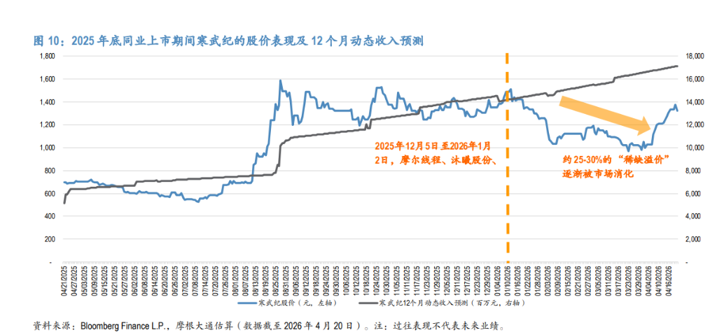 摩根大通引用了一个直接先例:寒武纪曾是A股唯一的纯AI芯片上市公司,2025年11月底股价约1500元人民币。随后摩尔线程、沐曦股份、壁仞科技在2025年12月至2026年1月相继上市,尽管寒武纪的12个月动态收入预测上调了17%、盈利预测上调了26%,股价年初以来仍下跌约2%,估值倍数收缩了约25-30%。