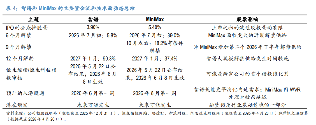 两家公司IPO时流通股极少:智谱约3.9%,MiniMax约5.4%。限售股将分批释放——