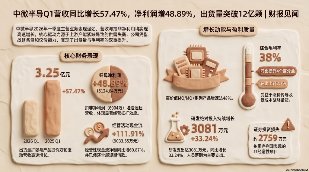上游晶圆代工产能持续紧张,正加速重塑芯片设计公司的盈利格局。中微半导体股份有限公司2026年一季度营业收入同比增长近六成,扣非净利润增幅超过一倍,主营业务呈现显著的高质量扩张态势。