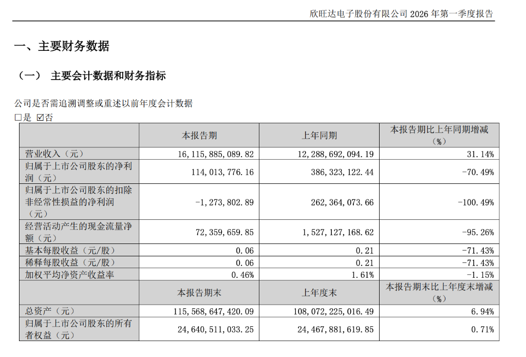 欣旺达电子披露的2026年一季报呈现显著分化。报告期内,公司实现营业收入161.16亿元,同比增长31.14%,动力电池业务保持高增长;但归母净利润仅为1.14亿元,同比大幅下滑70.49%;扣非净利润为-127万元,同比降幅达100.49%。