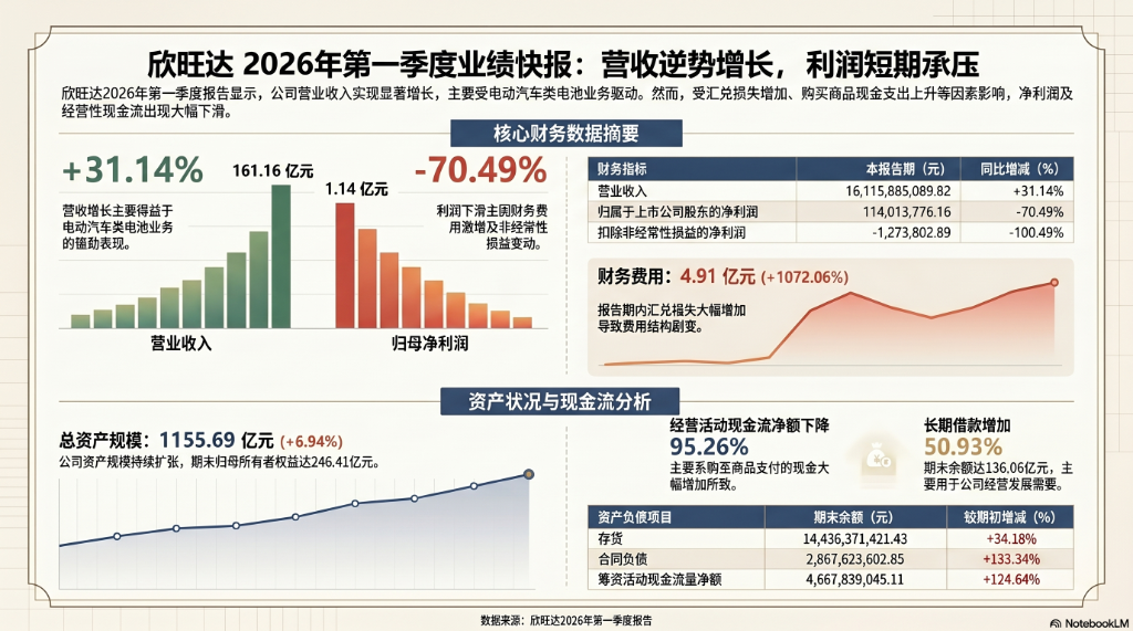 欣旺达2026年一季报呈现显著分化。营收161.16亿元,同比增长31.14%,动力电池业务驱动增长。但归母净利润仅1.14亿元,同比下滑70.49%,扣非净利为-127万元,主业已处盈亏边缘。财务费用因汇兑损失暴增1072%至4.91亿元,是利润承压主因。资产负债表显示公司正激进扩产:存货增34%、长期借款增51%,资产负债率升至72.8%。