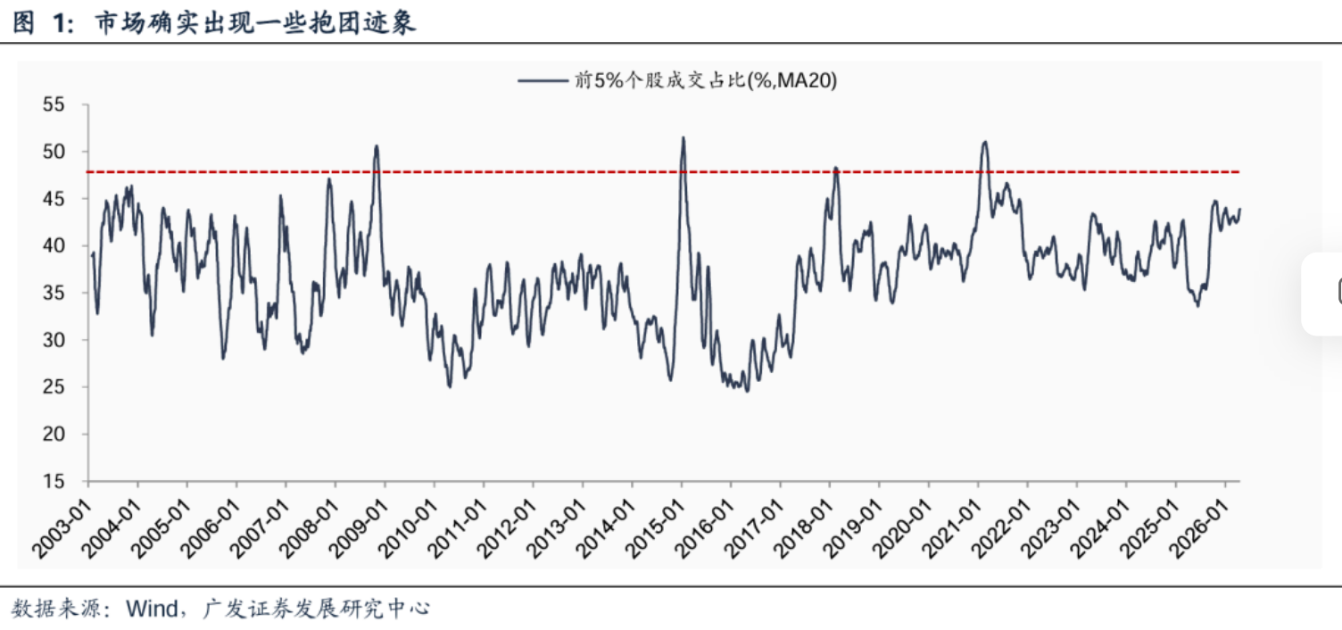 广发证券指出,当前市场拥挤度被高估。前5%个股成交集中度虽升至91.8%历史分位,但距峰值仍有空间,情绪指标未过热;同时历史上成交集中度对市场顶部的预警效果有限。在广谱需求疲软背景下,AI是2026年A股稀缺的高景气资产,高拥挤是技术革命下的常态,本身不构成离场理由。