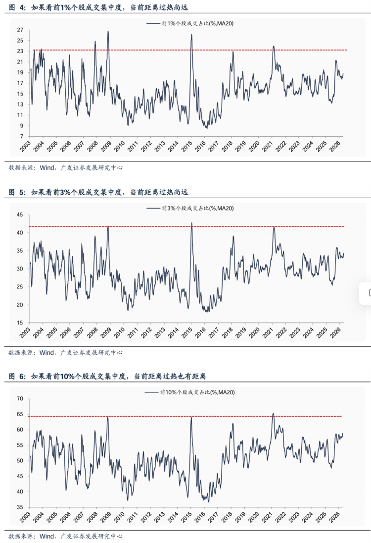 若采用不同口径衡量,信号则更为温和:前1%个股成交集中度历史分位数仅83.7%,前3%历史分位数为89.1%,前10%历史分位数为94.2%,均距警戒水位尚远。