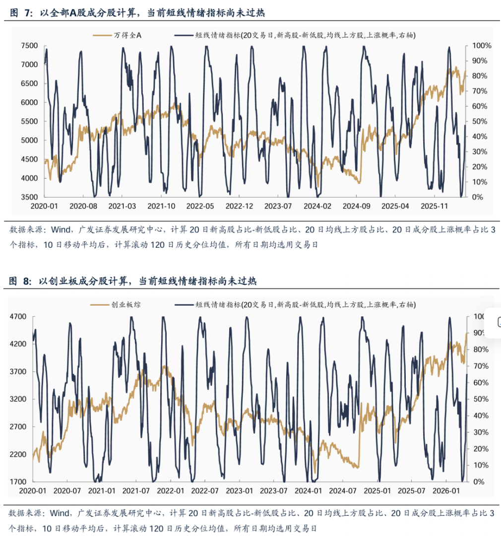 成交集中度只是刻画市场交易的一个维度。报告依据20日新高股与新低股占比差值、均线上方股占比及上涨概率占比等要素构建的短期情绪指标自3月以来从底部修复后,同样尚未提示过热。