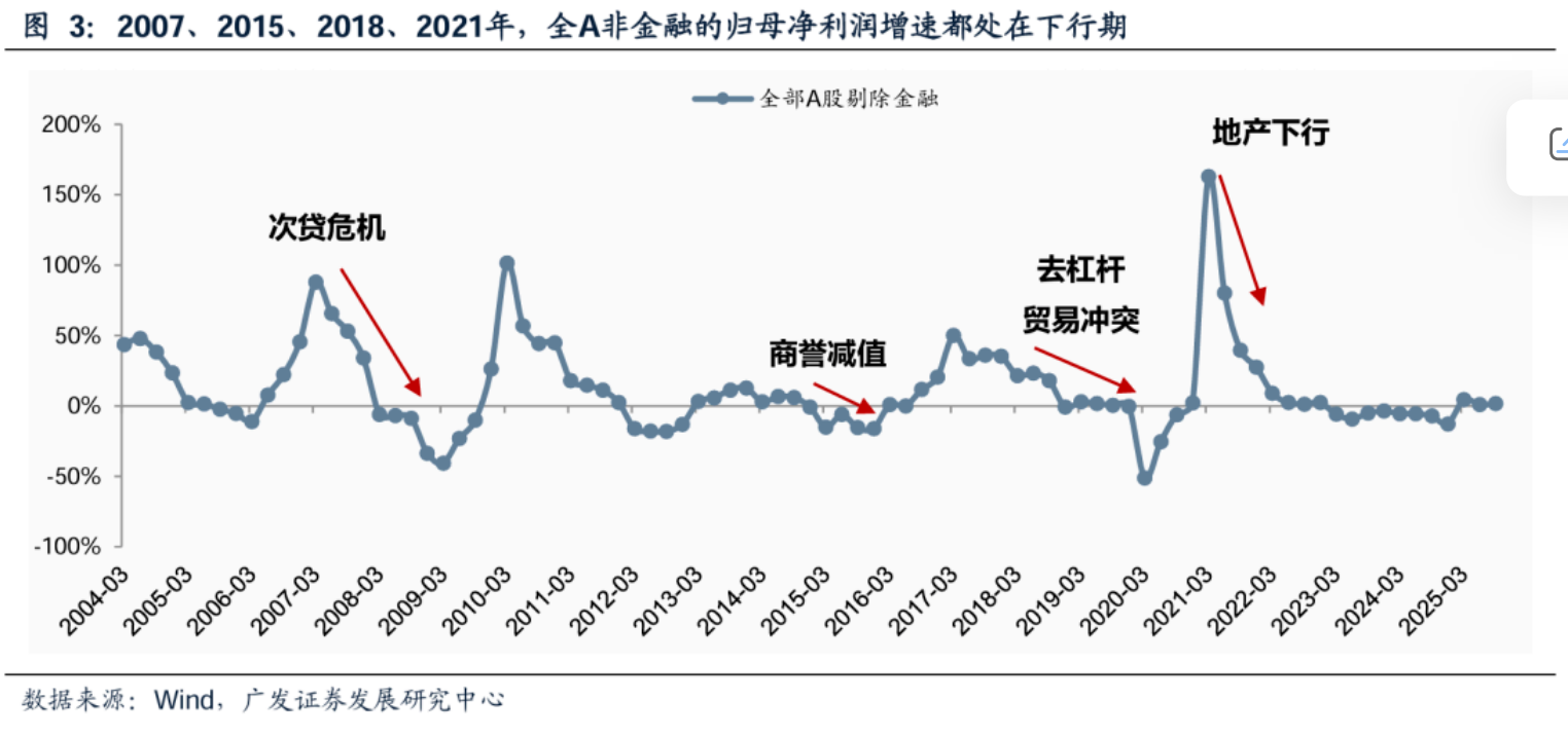 2007年次贷危机冲击基本面,2015年大量并购重组产生的业绩承诺未能兑现、商誉减值隐患早已埋下,2021年茅台等白酒增速降速、白电受成本与地产双重压制。三次行情见顶均伴随全A非金融归母净利润增速处于下行通道。