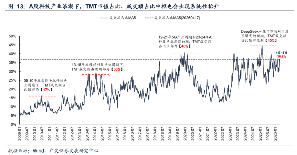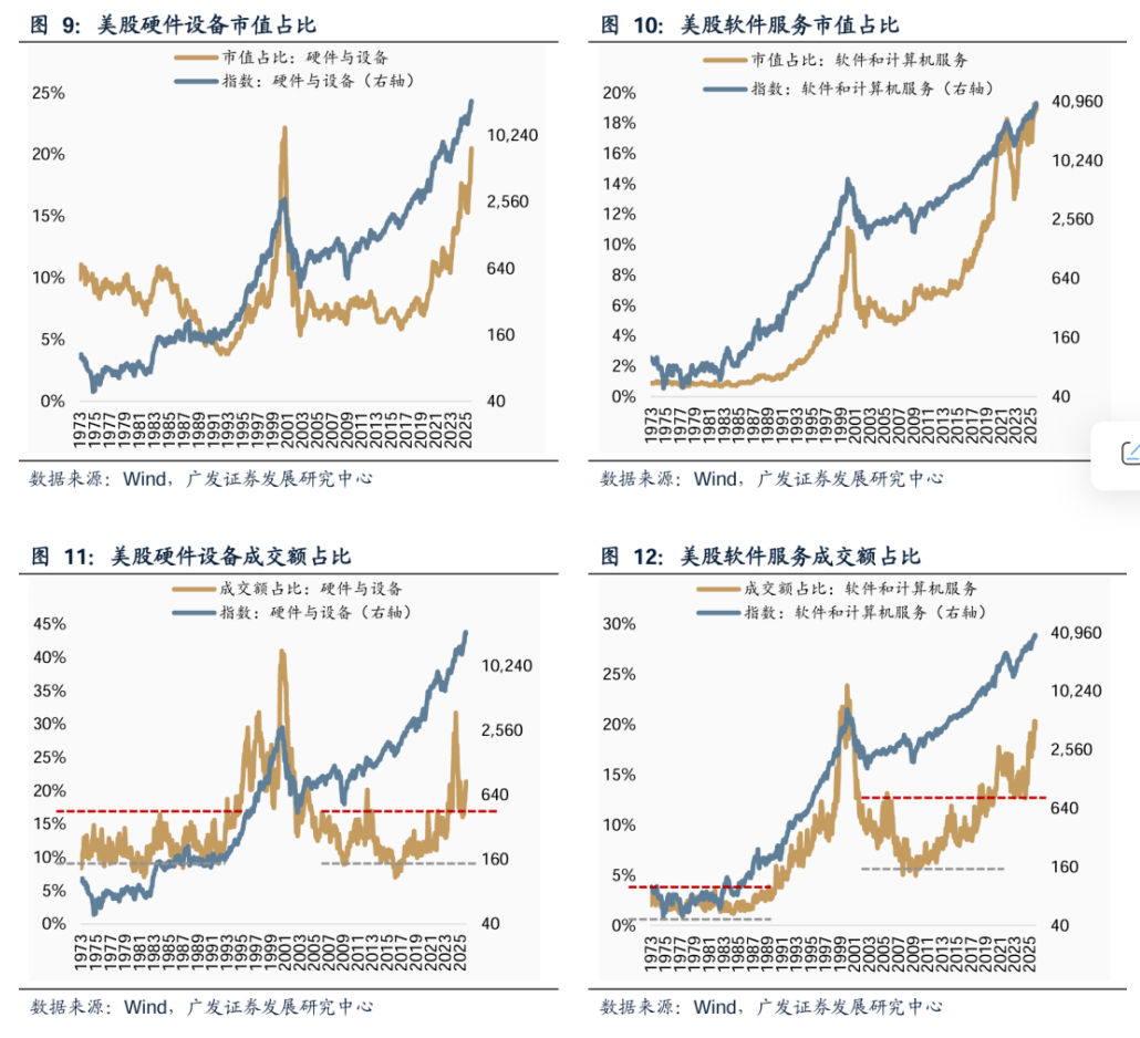 参考美股经验,每一轮科技产业浪潮都会带来硬件设备及软件服务板块市值占比与成交额占比的系统性抬升。