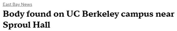 第二起事件发生在周三中午12点左右,校方工作人员在Sproul Hall外草坪的灌木丛中发现一具男性遗体。
