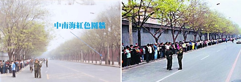 上面的左图:“人”字表示法轮功学员在警察的指挥下所站的地方,处在中南海的西边和北边,而中南海南边的正门——新华门、东边根本没有法轮功学员。