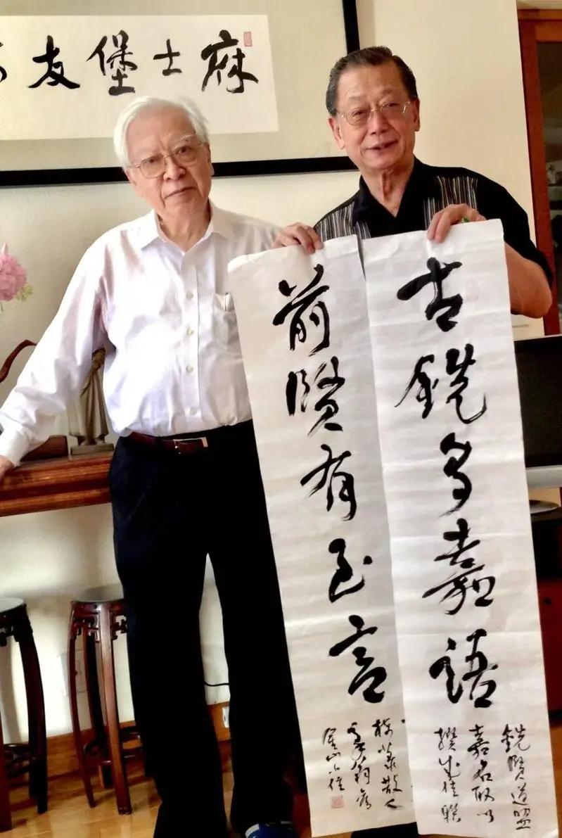 湾区著名书画家古铣贤(右)撰文追忆欧豪年大师(左),笔歌墨舞寄深情。(受访者供图)