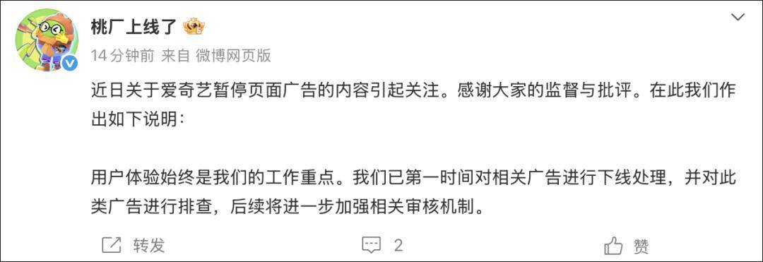 相关话题引发激烈讨论。23日晚,爱奇艺公司官方发言人@桃厂上线了 发文称:“已第一时间对相关广告进行下线处理,并对此类广告进行排查,后续将进一步加强相关审核机制。”