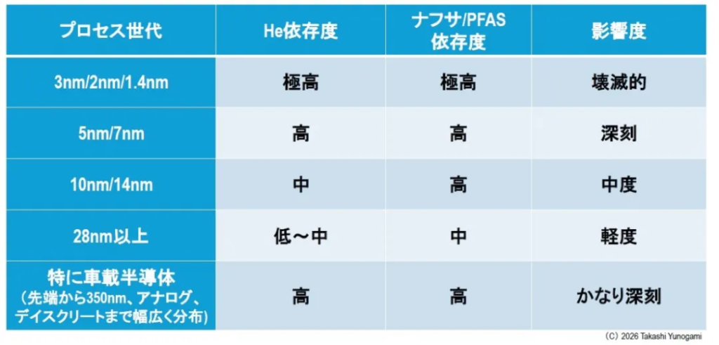 传统上,汽车半导体主要采用成熟的28nm或更高制程节点,优先考虑可靠性、长期供货和模拟特性。然而,近年来,一些应用,例如自动驾驶SoC,开始采用16nm或更低制程节点,其应用范围也从先进节点扩展到超成熟的350nm节点,甚至包括分立元件。这种结构意味着汽车半导体同时面临着先进节点固有的氦气依赖风险和成熟节点固有的材料依赖风险(例如石脑油衍生材料和PFAS材料)。