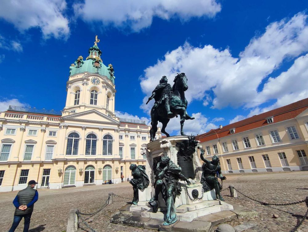 这宫殿叫夏洛滕堡宫,在柏林的景点排不进前十,不是很著名。四百多年前最早不过是一处夏日消暑的行宫,还不属于柏林。后来一点点添出来,成了如今这副模样。这座宫,不张扬,颜色也温和,黄里带一点灰,有历史感。院子里有一尊骑马的铜像立在石座上,那是腓特烈·威廉一世,后来腓特烈大帝的爷爷,四周安着几个俘虏和奴隶,或坐或立,各自想着各自的事。