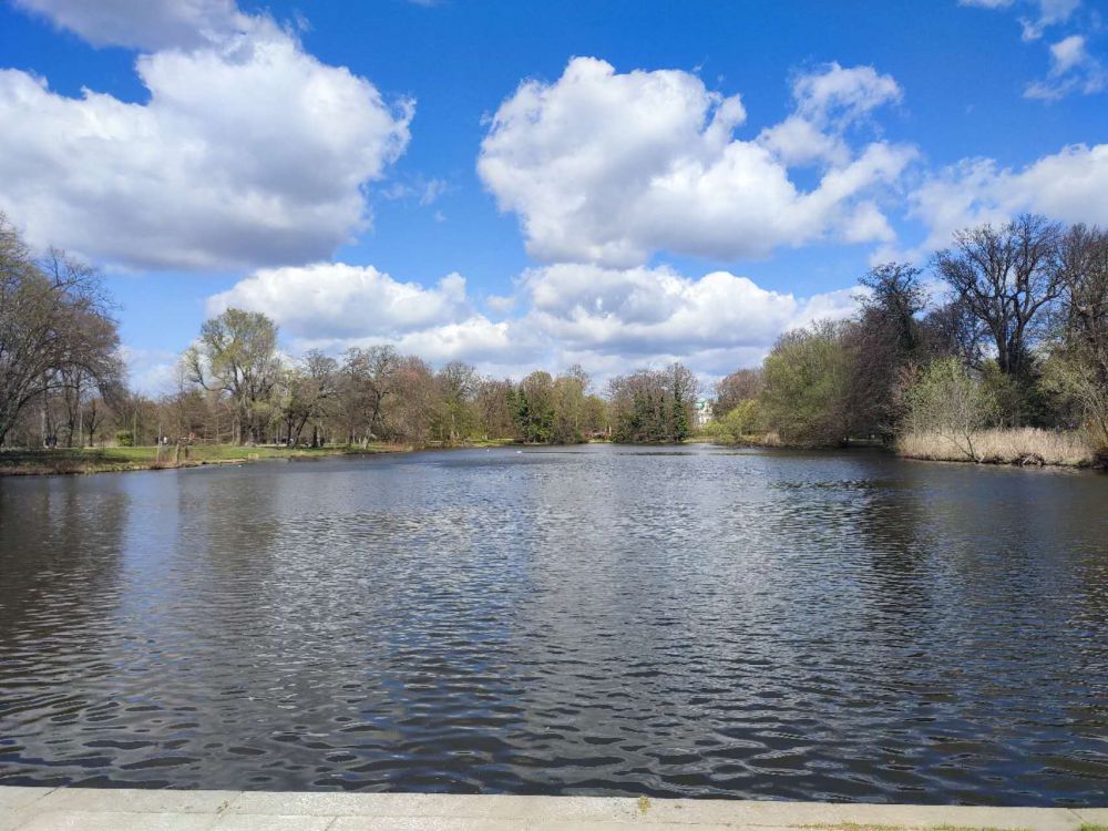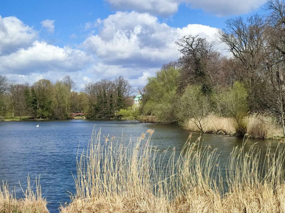 前半段规矩,草坪修得整齐,路笔直,树排得像队伍,有点像凡尔赛宫的样子。再往里走,就往英国花园的方式过渡了,水也出来了。湖不大,风一吹,起细纹。芦苇还带着冬天的干黄,边上已经冒出一点新绿。水面上有天鹅,白得干净,也不怕人,慢慢游,偶尔低头,像在水里找吃食。