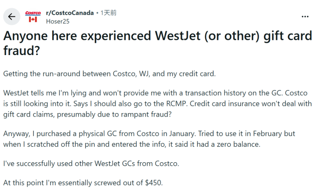 近日,一位加拿大网友在 Reddit 的 r/CostcoCanada 社区发帖,讲述自己在 Costco 购买 WestJet 礼卡却遭遇余额清零的经历。该网友表示,今年 1 月在 Costco 购入一张实体 WestJet 礼卡,2 月尝试使用时,发现卡内余额已为零,实际损失高达 $450 加元。向 WestJet 求证时,对方既拒绝提供交易记录,又质疑其说法的真实性;Costco 方面则表示还在调查,并建议其向皇家骑警(RCMP)报案。信用卡公司则以不受理礼卡相关理赔为由,拒绝协助。