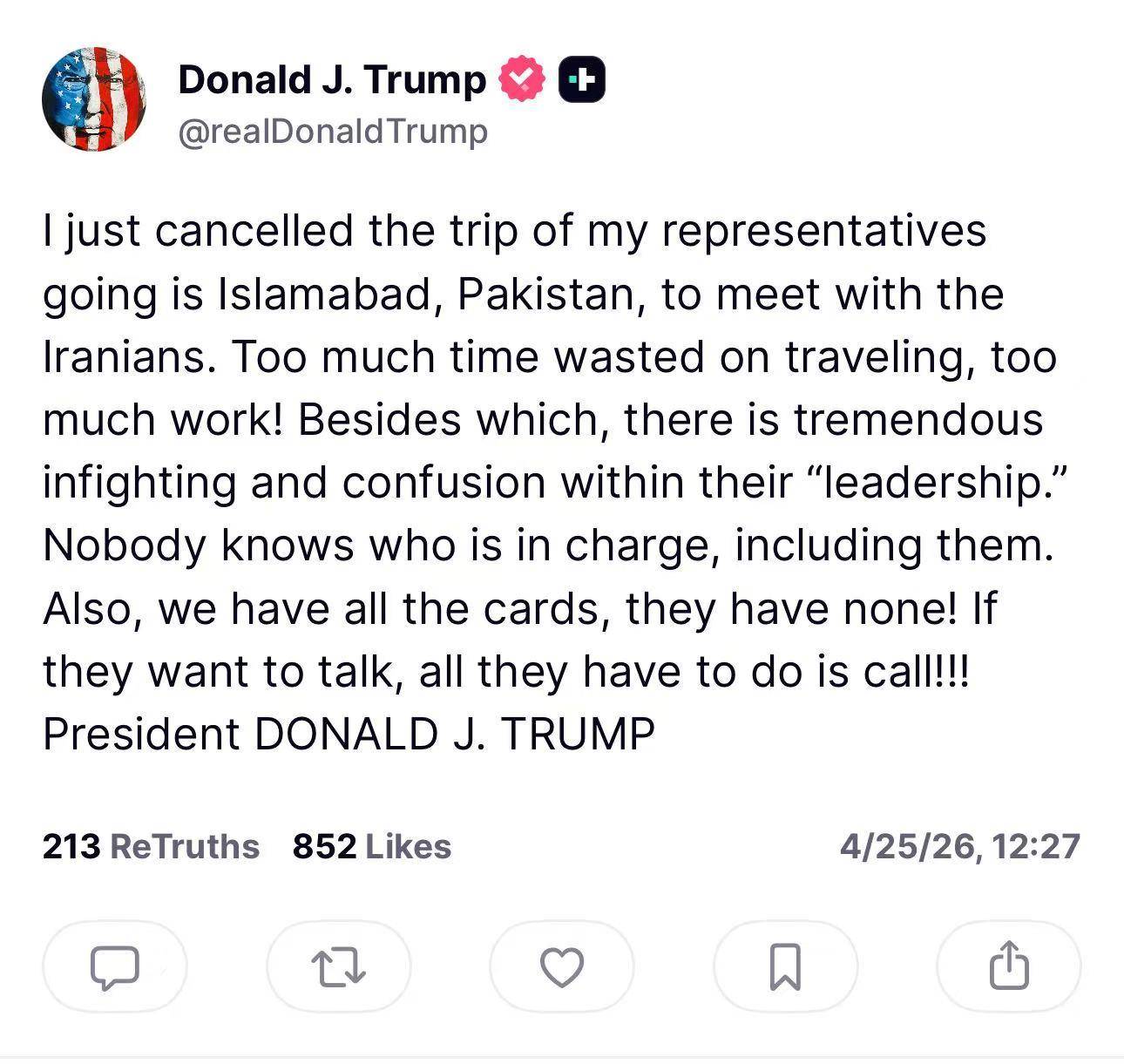 在伊朗代表团结束对巴基斯坦的访问之后,美国总统川普25日在社交媒体上宣布,他取消了美方代表前往巴基斯坦首都伊斯兰堡“与伊朗方面会晤”的行程。