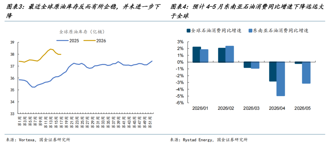 (1)实体经济层面,原油断供的影响还未真正全面扩散,大部分经济体还能“扛得住”。这一轮中东的原油接近断供之后,全球的原油库存反而下的比较慢,这延缓了市场对于主要经济体遭遇的供给担忧,核心原因可能在于:一方面有很多美伊冲突爆发之前还未到港的原油陆续到港,补充了库存;另一方面原油的消费也在同步下降,以东南亚国家为代表的地区率先承受了这一轮油价上涨带来的对需求的破坏,让渡出了大量需求。