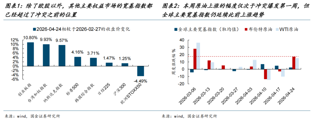 自4月初美伊冲突进入谈判、阶段性缓和之后,全球权益市场出现了明显的反弹,除了欧股以外,其他主要市场的宽基指数都已经回到甚至超过了冲突爆发之前的位置,尤其是潜在冲击较大的日韩/中国台湾。但值得思考的是大多数与能源直接相关的商品价格其实并未回到冲突之前,油价甚至在本周(2026-04-20至2026-04-24,全文同)出现了大幅反弹,布伦特原油/WTI原油期货周度分别上涨17.15%/14.88%,幅度仅次于3月初美伊冲突刚刚爆发的那一周,但权益市场本周不为所动,大多指数仍在继续上涨。