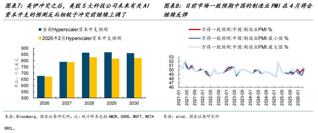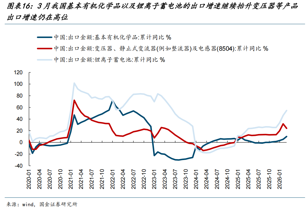 (2)制造业侧,一方面依托于能源稳定性和成本优势(以化工为代表),另一方面受益于此前产能建设带来的产能优势(以新能源为代表),未来中国的制造业将会成为全球制造的压舱石。可以看到美伊冲突爆发之后,3月我国基本有机化学品以及锂离子蓄电池的出口增速继续抬升,而变压器等产品的出口增速仍维持高位。