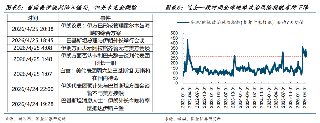 (2)美伊谈判还在反复,由于川普和美国政府在社交媒体、舆论上的影响力,以及不断释放的和谈信号,让市场认为通航可以被解决,于是市场并不定价远期库存耗尽的场景。而在过去一段时间内,全球地缘政治风险指数见顶回落。