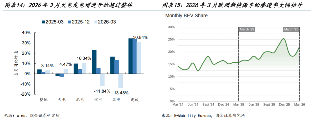 (1)能源侧,对于传统能源而言,在能源安全的诉求下将会作为压舱石,由于国内能源成本优势和供应稳定性,在国内外能源价差依旧存在的背景下,油和煤炭可能迎来“量价齐升”。可以看到2026年3月我国火电当月发电量同比增速已经开始超过整体发电量增速,比2025年同期(3月)以及上一期(12月)都要强。对于新能源而言,我国产能优势明显,未来将受益于全球能源转型加速的趋势。可以看到在美伊冲突之后,欧洲对于新能源车的需求又开始出现明显增长,2026年3月欧洲新能源车的渗透率大幅抬升。