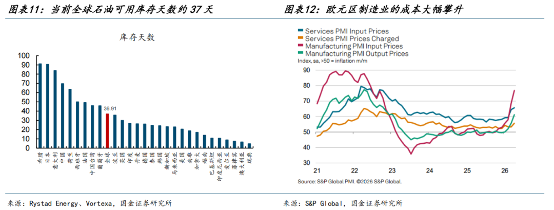 最后,如果中东原油持续处于接近断供的状态,库存终将耗尽,带来产业链供应极大的不确定性。经过我们的测算,基于可得数据,用2026年4月22日的全球石油库存数据/2026年3月的全球石油日均消费数据,可以得到全球主要国家的石油可用库存天数,全球平均水平是约37天。而实际上,供应链的影响已经在欧洲制造业有所显现:根据标普500全球的报告/数据显示,4月欧元区PMI分项中供应商的交货时间已经延长至2022年年中以来的最大值,制造业的投入成本也以自2022年年底以来最快的速度上升,上述因素共同导致了欧元区4月的PMI不降反升。