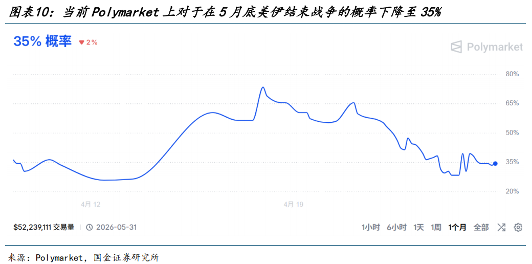 其次,美伊谈判虽然还未彻底“关闭”,但市场已经开始因为不断的反复“失去耐心”,根据Polymarket的数据显示,市场对于美伊在五月底前结束整个战争的概率大幅下调,从4月17日最高的74%下降至目前的35%。