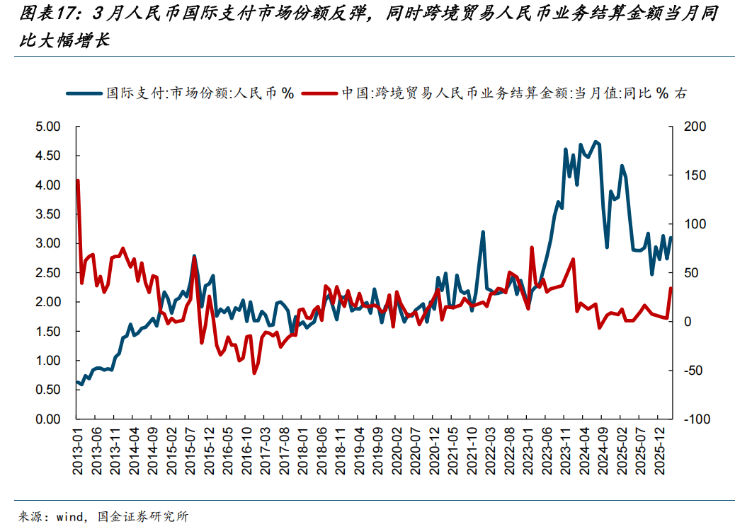 (3)基于能源和制造业可能产生的贸易流,人民币国际化的进程可能会进一步加速。类比俄乌冲突之后人民币的国际支付市场份额大幅抬升,这一轮美伊冲突之后可能也会出现类似的情形。可以看到2026年3月人民币国际支付市场份额反弹,同时跨境贸易人民币业务结算金额当月同比大幅增长。