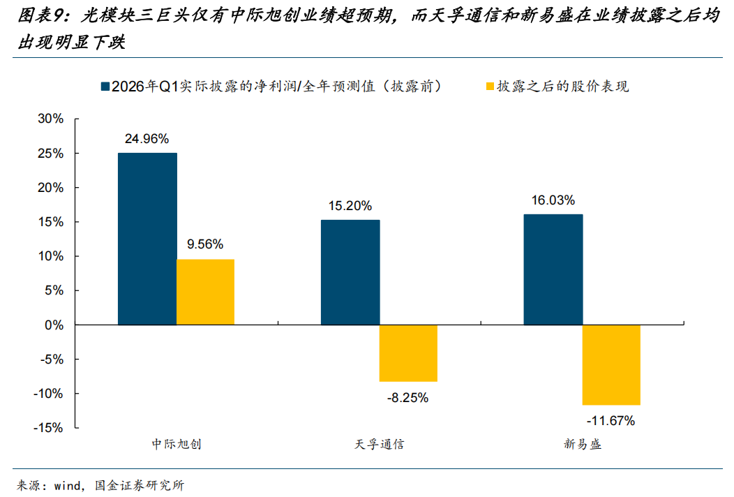 首先,对科技股高景气的业绩交易窗口可能正在逐步过去,未来需要寻找到新的催化。而实际上以新易盛、天孚通信为代表的典型个股的业绩反而低于市场预期,由此带来了板块内部的股价表现分化。