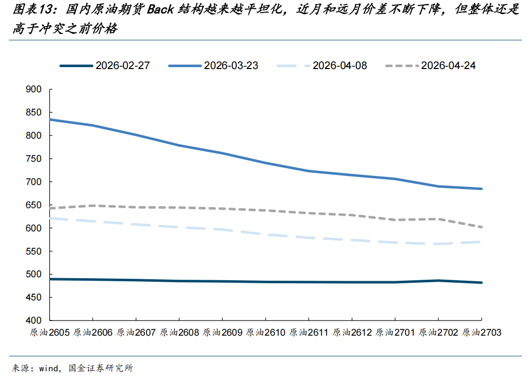 同样地,随着时间的推移,我们认为市场终将认知到能源价格的中枢上移。我们选取四个特定的时点观测国内原油期货的期限结构,发现自美伊冲突以来,国内原油期货的Back结构越来越平坦化,即近月和远月油价的价差不断缩小,截至2026年4月24日原油2605合约和2703合约的价差约40元/桶。但整体价格还是高于2026年2月27日美伊冲突爆发前。上述结构变化意味着短期的紧张有所缓解,但远期的中枢价格上移确定性也很强。