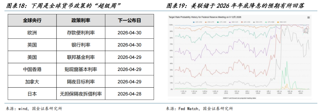 此外,能源价格中枢抬升对全球央行货币政策的影响也会逐步显现。下周是全球货币政策的“超级周”,需要关注主要央行对于当前经济增长VS通胀预期的表态。近期美联储于2026年年底降息的预期有所回落,欧央行虽然4月预期按兵不动,但可能会在6月加息。远期货币政策边际收紧的预期导致了贵金属的下跌,金融资产可能同样受到冲击。