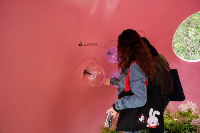 生命始于一粒微渺细胞,入口处花海间错落浮动的粉色泡泡设计,把生命最初的懵懂悸动与包裹感具象化,一场浪漫“对话”从此“启程”。