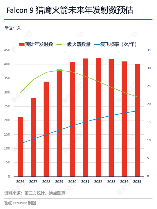 目前,SpaceX 已经把一级火箭的制造流水线跑通,每年能稳定新造 7 到 9 枚。如果单枚火箭的复飞寿命全部逼近 40 次极限,且翻修时间持续缩短,猎鹰 9 号的发射频次远未到顶。按照规划,它的发射频次将在 2030 年前后冲击每年 400 次的峰值,随后回落并稳定在每年 360-370 次左右。