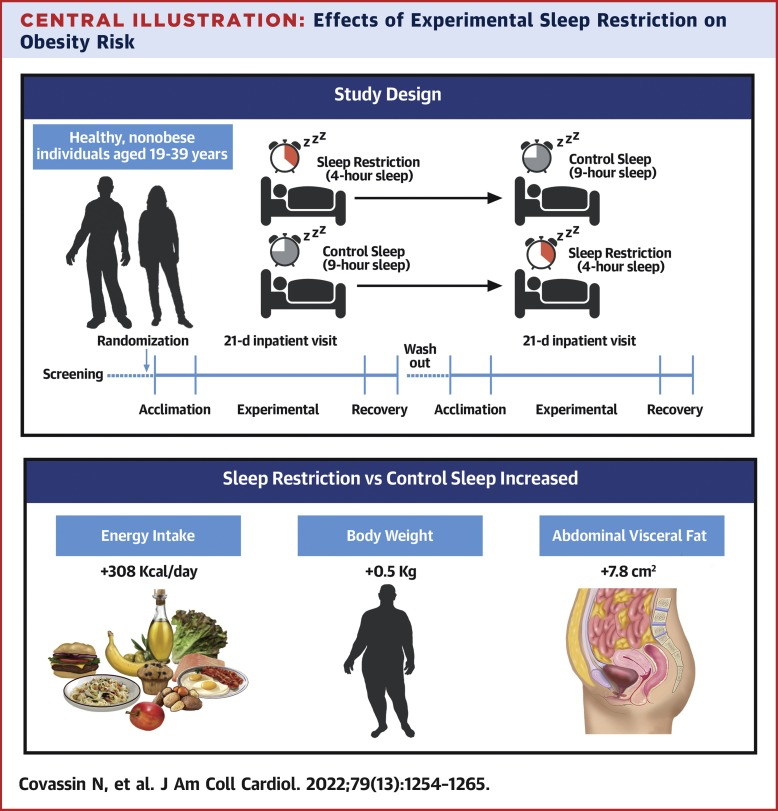 美国梅奥医学中心的研究人员在JACC上发表了一项研究,对 12 名年龄在 19~39 岁之间的健康人进行临床试验,对比睡眠限制组(每晚睡 4 小时)和睡眠对照组(每晚睡眠 9 小时),经历了两个 21 天的实验周期发现,睡眠不足的参与者摄入的热量增加,但能量消耗几乎没有变化,且无法通过补觉恢复。