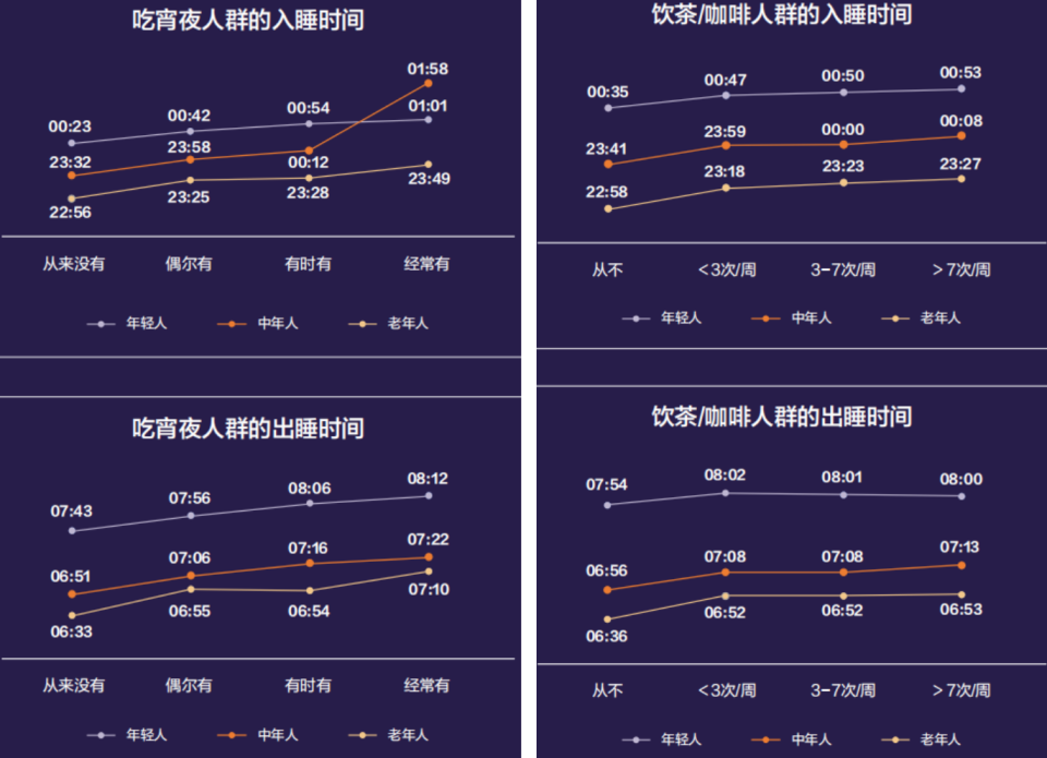 而且,晚睡在年轻人中尤为普遍,一半以上 00 后和将近一半 90 后的入睡时间晚于 12 点。