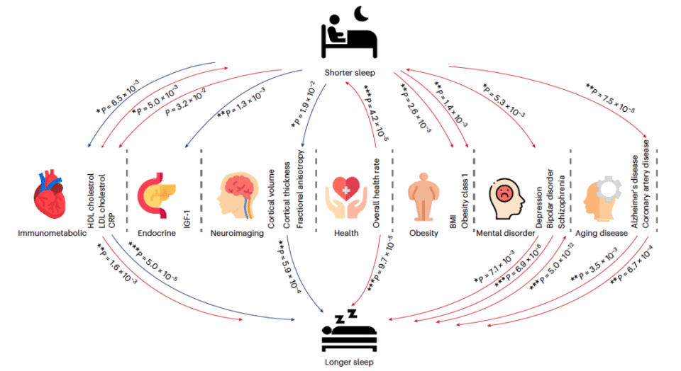 研究团队继续进行了双样本孟德尔随机化分析最终验证:短睡眠是多种健康问题的潜在诱因,包括抑郁症风险、冠心病风险及肥胖症概率等;而长睡眠则更多是诸多健康问题的“结果”而非“诱因”,例如阿尔茨海默病、精神分裂症和冠心病等,均可能导致长睡眠的发生。