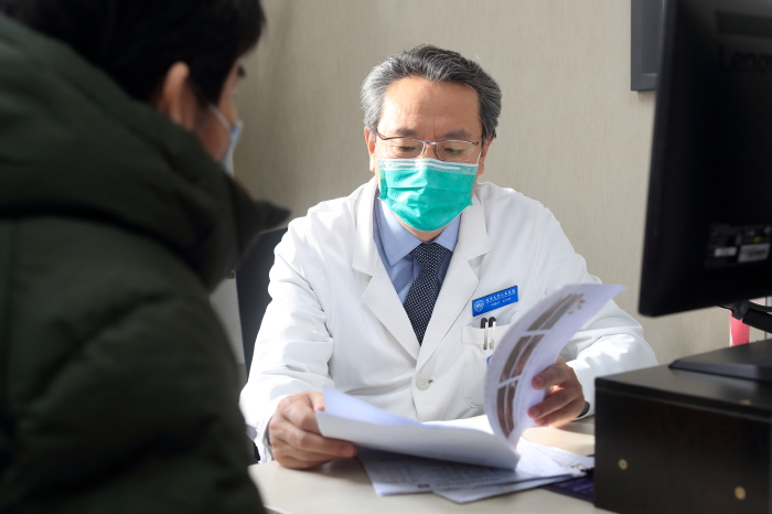申占龙门诊与患者交流。