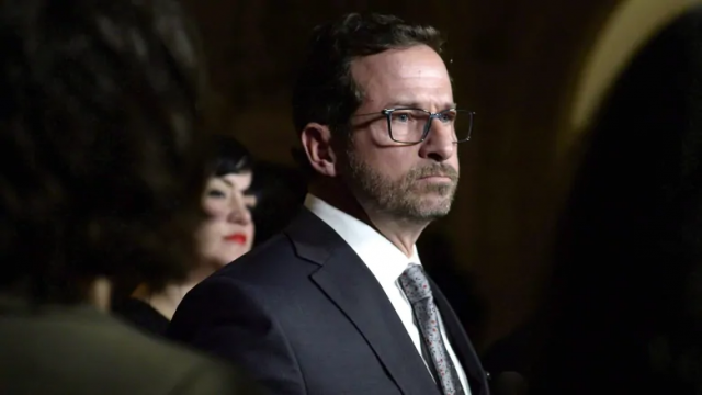 新民党(NDP)领袖艾维·刘易斯在卡尼政府概述其春季财政计划后,在下议院大厅向媒体发表讲话。