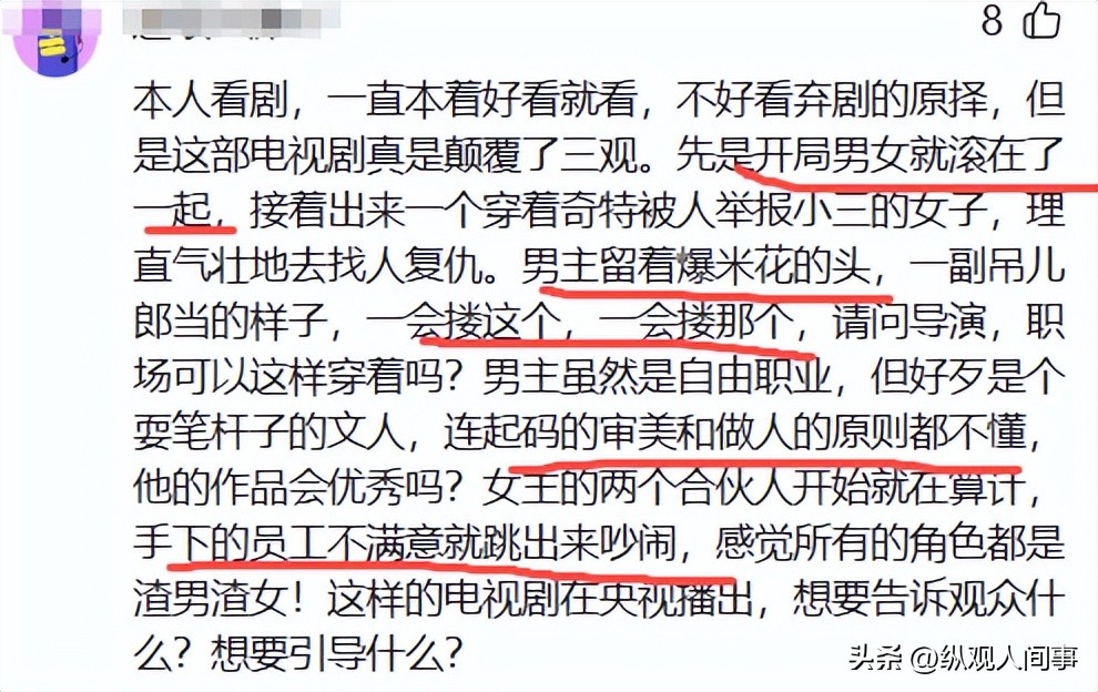 不少网友疑惑,这样一部全员“三观不正”的剧,为何能在央视播出,更质疑其传递的价值观:“这样的电视剧,想要告诉观众什么?想要引导什么?”