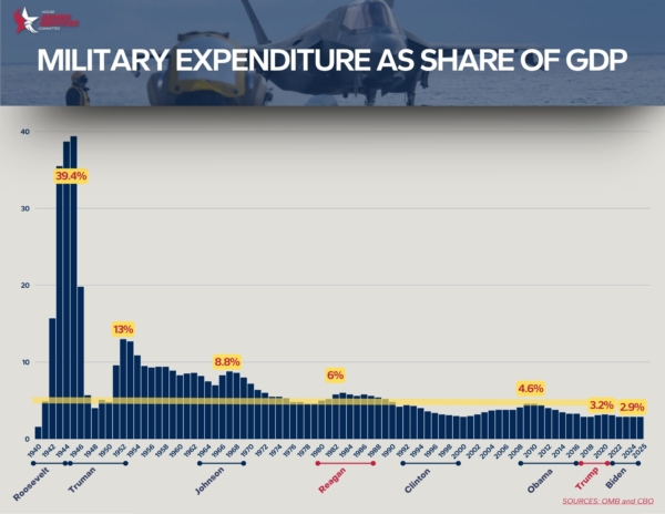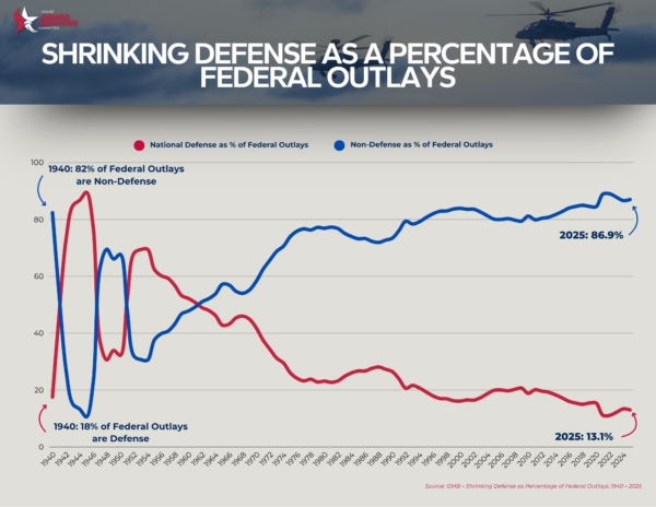 历史表明,国防投资达到或超过GDP的4%至5%,才能真正有效威慑对手。这也是美国要求盟友达到的标准,但多年来美国自身并未做到。美国自二战以来,国防支出占联邦总支出的比例已大幅下降。目前,国防开支占联邦政府总开支约13%,非国防开支则占85%以上。
